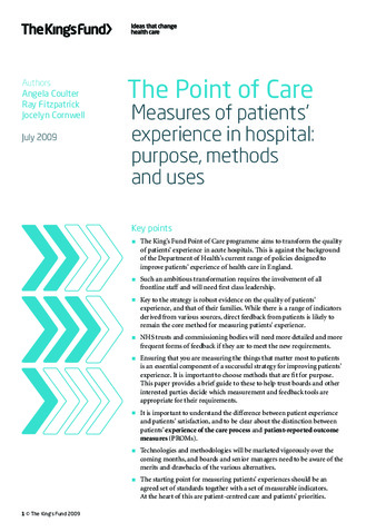 The point of care : measures of patients' experience in hospital : purpose, methods and uses.