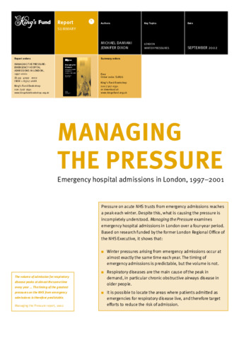 This is a summary of a report on emergency hospital admissions in London, funded by the former London Regional Office of the NHS Executive. It examines the nature of emergency admissions in London, pointing out that the main peaks in demand appear to be due to respiratory disease during the ...