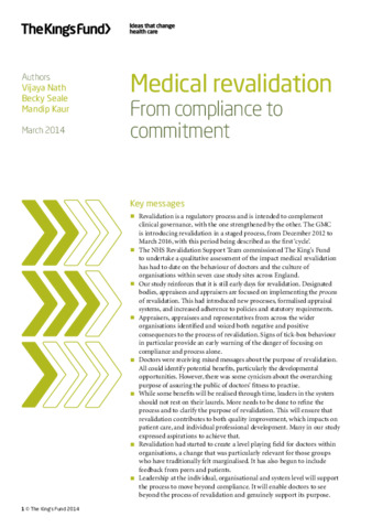 Medical revalidation of doctors became a statutory obligation for all employing organisations in 2012, but its origins stretch back to 2000. In that period, the NHS has undergone many changes and been scrutinised by several reviews. It was against this shifting context that The King's Fund carried out a qualitative ...