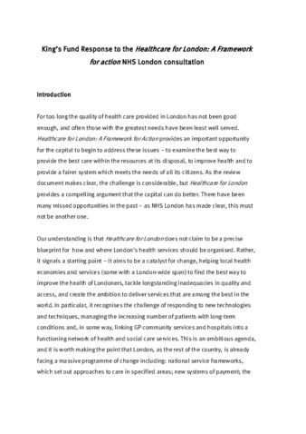 King's Fund response to the Healthcare for London : a framework for action NHS London consultation.