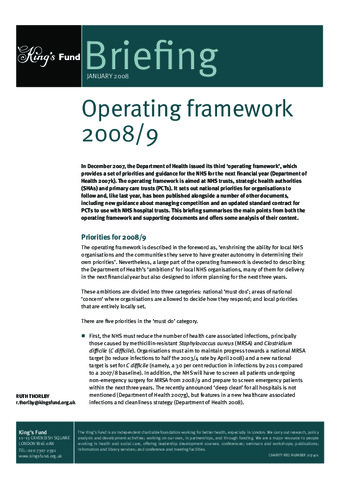 In December 2006, the Department of Health issued its second 'operating framework', The NHS in England: The operating framework for 2007/08, which provides a set of rules and guidance for NHS organisations in England for the year ahead. Aimed primarily at managers and clinical staff, the operating framework for 2007/8 ...