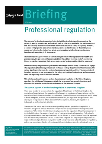 This briefing outlines the current system of professional regulation in the UK; describes the criticisms of this system; details the government's proposals for reform; and discusses the potential strengths and weaknesses of the proposed changes [Introduction]