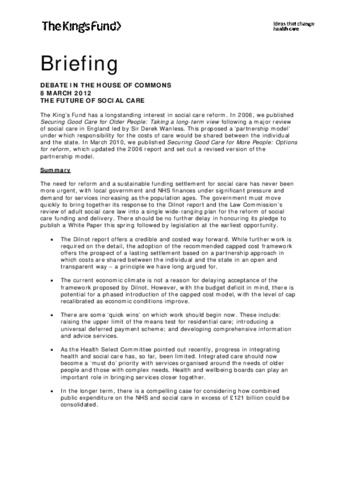 Briefing : debate in the House of Commons : the future of social care.