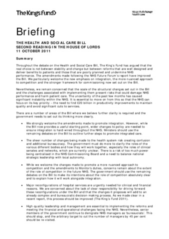 Briefing : the Health and Social Care bill : second reading in the House of Lords.