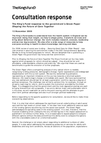 This consultation response includes the following overarching observations. First, it is vital that reform addresses the significant overall underfunding of adult social care and the high levels of unmet need. Second, the challenge is not simply about responding to additional numbers of older people. It is also about addressing the ...