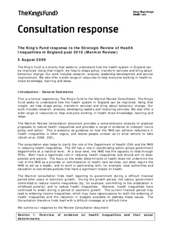 The Marmot Consultation provides a range of evidence on proposals which will reduce health inequalities. Improved partnerships and working across services will be extremely valuable in reducing health inequalities. There is a real opportunity for the DH, nationally, and the NHS, locally, to use their experience and knowledge to act ...