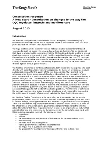 We welcome the opportunity to contribute to the Care Quality Commission (CQC) consultation on changes to the way it regulates, inspects and monitors care. This short paper sets out the views of The King’s Fund.